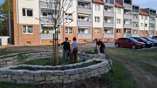 NABU-Mitglied und Mieterinnen bei der Bepflanzung